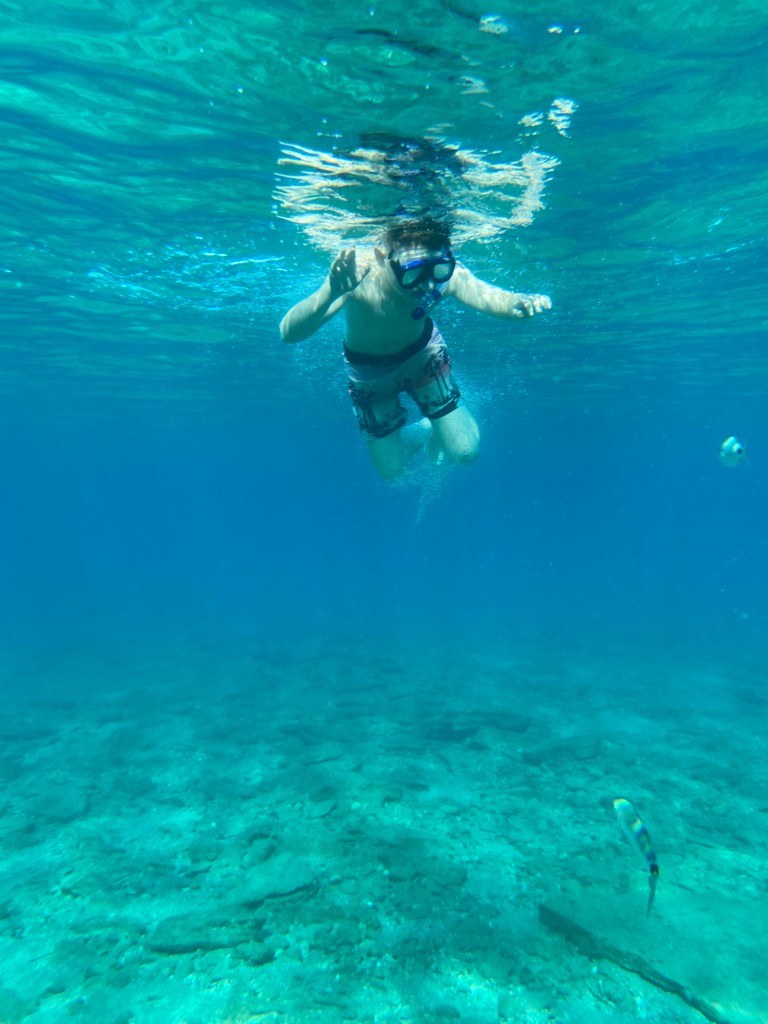 After our trip to the vineyard we drove the short distance to Fokos Beach which takes you along the side of a reservoir river bed. This partly made track along a steep valley definitely gave James Bond film set vibes. It was worth the drive as the beach was practically deserted and we enjoyed a couple of hours of sunbathing, digging and snorkelling before heading home to the villa …and the wine which by that time we felt we had earnt.
