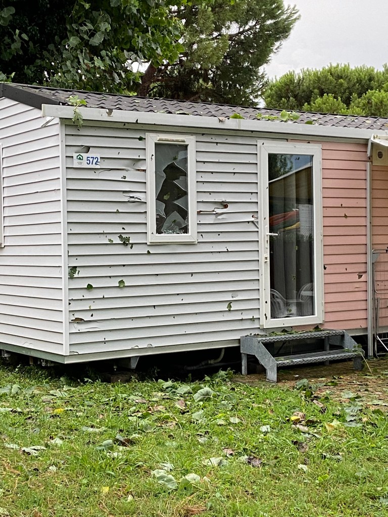 Retreating into the mobile home to avoid being hit, the atmosphere became quite frightening for the kids and worrying for the adults. After about 10 minutes the hail relented and the storm moved on. Venturing back outside we found that there were holes in the cladding to the sides of many mobile homes, many smashed windows, smashed barbeques, sun loungers and patio furniture on all of the pitches. The roads and paths had a deep covering of leaves and branches which had been shredded from the trees.