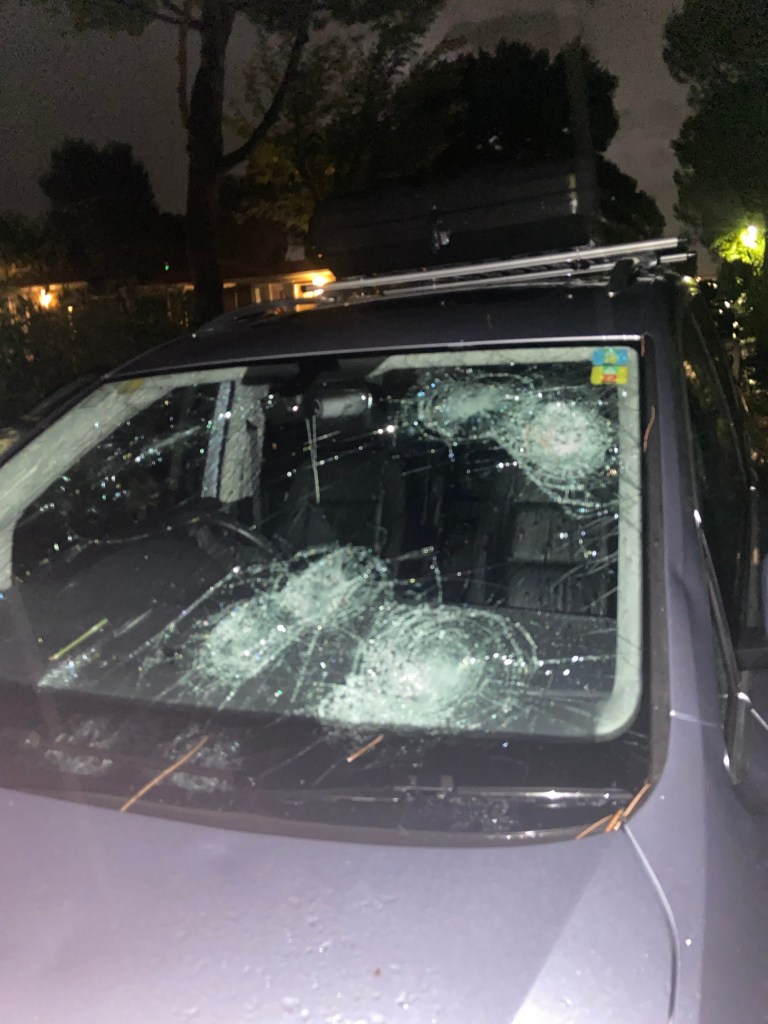 The inside of the car was absolutely covered in thousands of shards of glass and the front windscreen was loose and could easily have been pushed in. There was similar damage on all of the cars on the campsite and in the surrounding area / town.