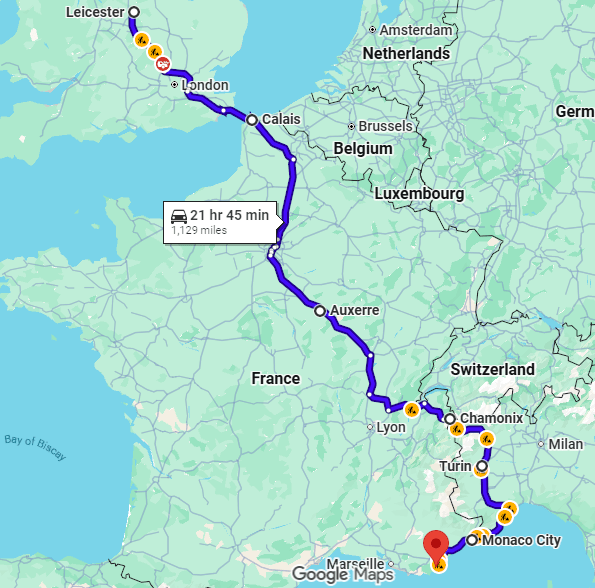 With two and a half weeks booked off work we had allowed ourselves four days and three nights to travel down to the campsite. We booked the Channel Tunnel crossing and the direct route from Leicester to Port Grimaud would have been approximately 930 miles and 16 hours of driving.
